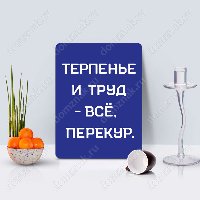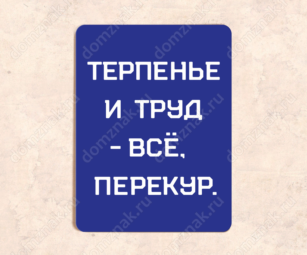Табличка «Терпенье и труд - все, перекур» изготовлена из пластика ПВХ, толщиной 4 мм. Изображение наносится по технологии УФ-печати. Табличка предназначена для использования как в помещении, так и на улице.