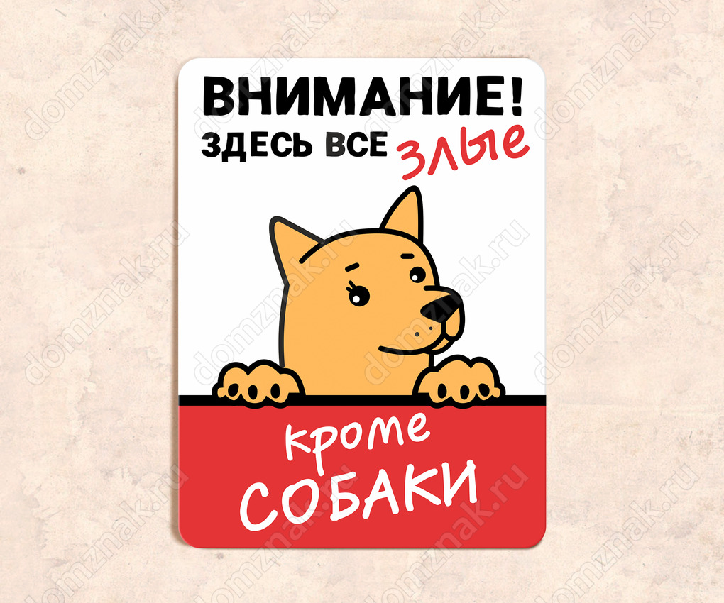 Табличка «Внимание! здесь все злые кроме собаки» изготовлена из пластика ПВХ, толщиной 4 мм. Изображение наносится по технологии УФ-печати. Табличка предназначена для использования как в помещении, так и на улице.